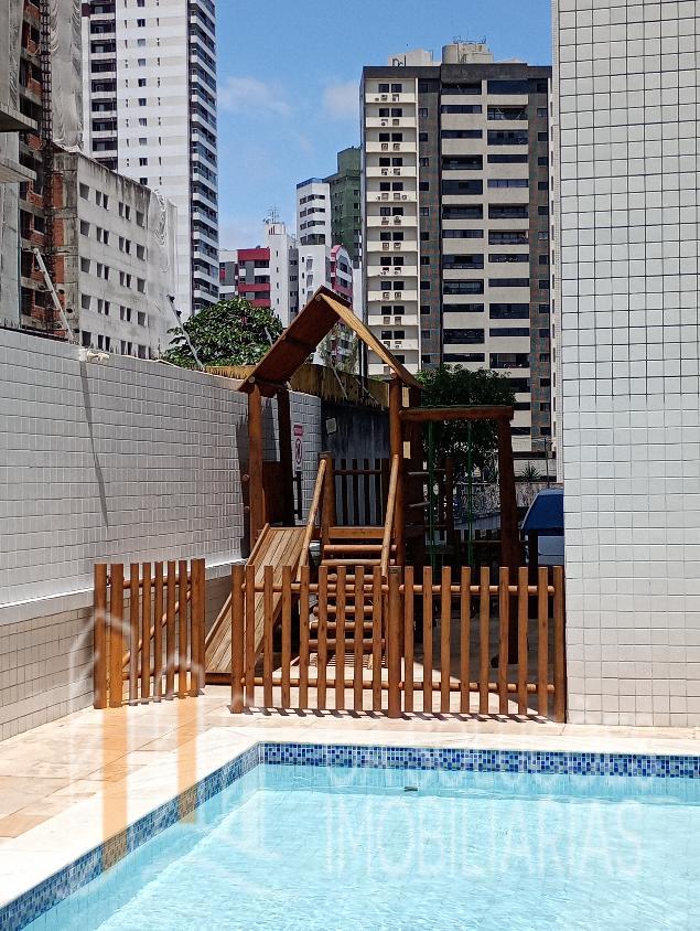 Portaria 24 horas, 2 elevadores, três apartamentos por andar, prédio pilotis, cerâmica na fachada, piscina, salão de festas e playground.